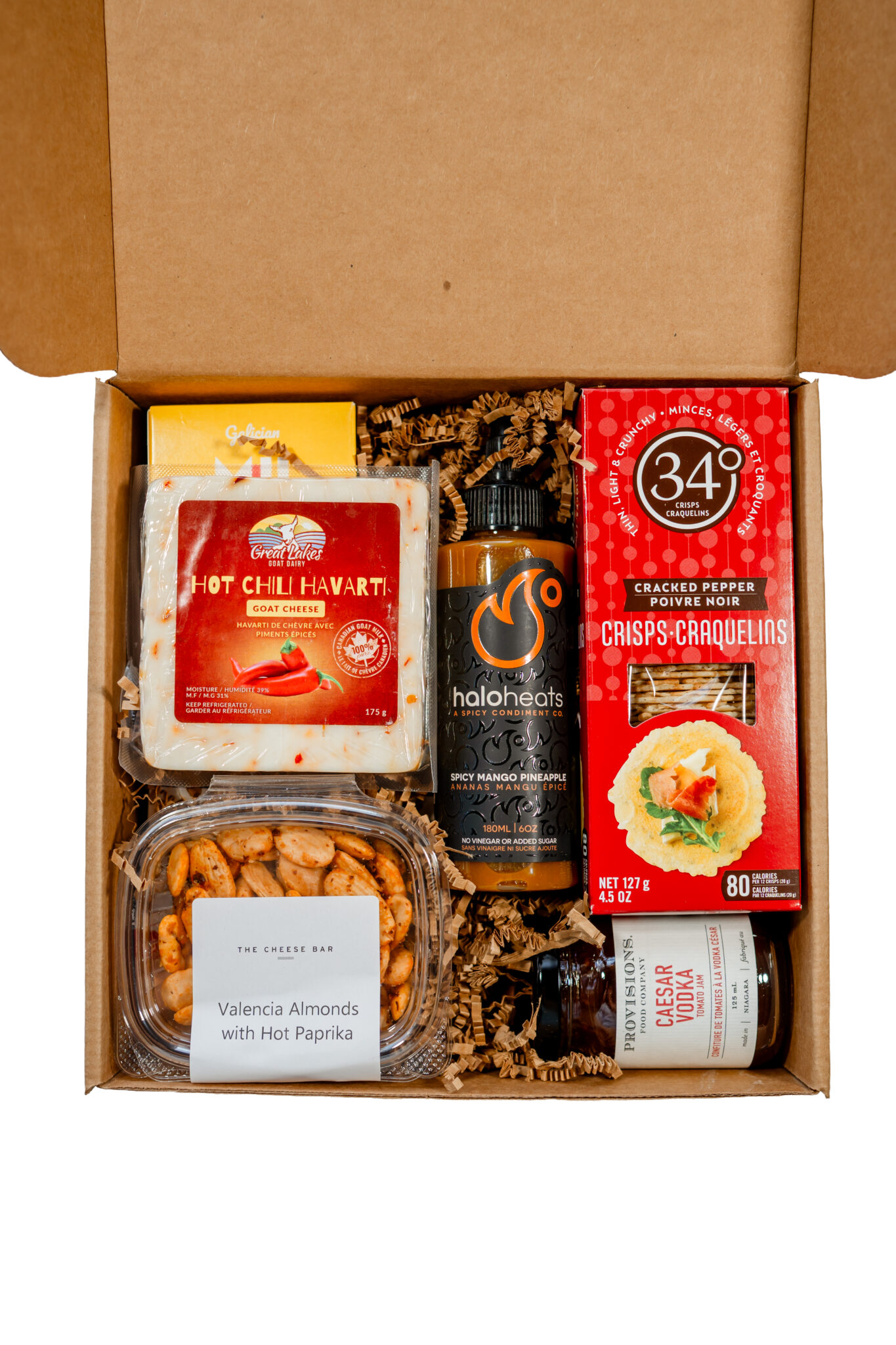 hot paprika marcona almonds, spanish seafood tin, hot stickinis, halo heats hot sauce, 34 degree crackers, caesar vodka preserve, hot chili havarti