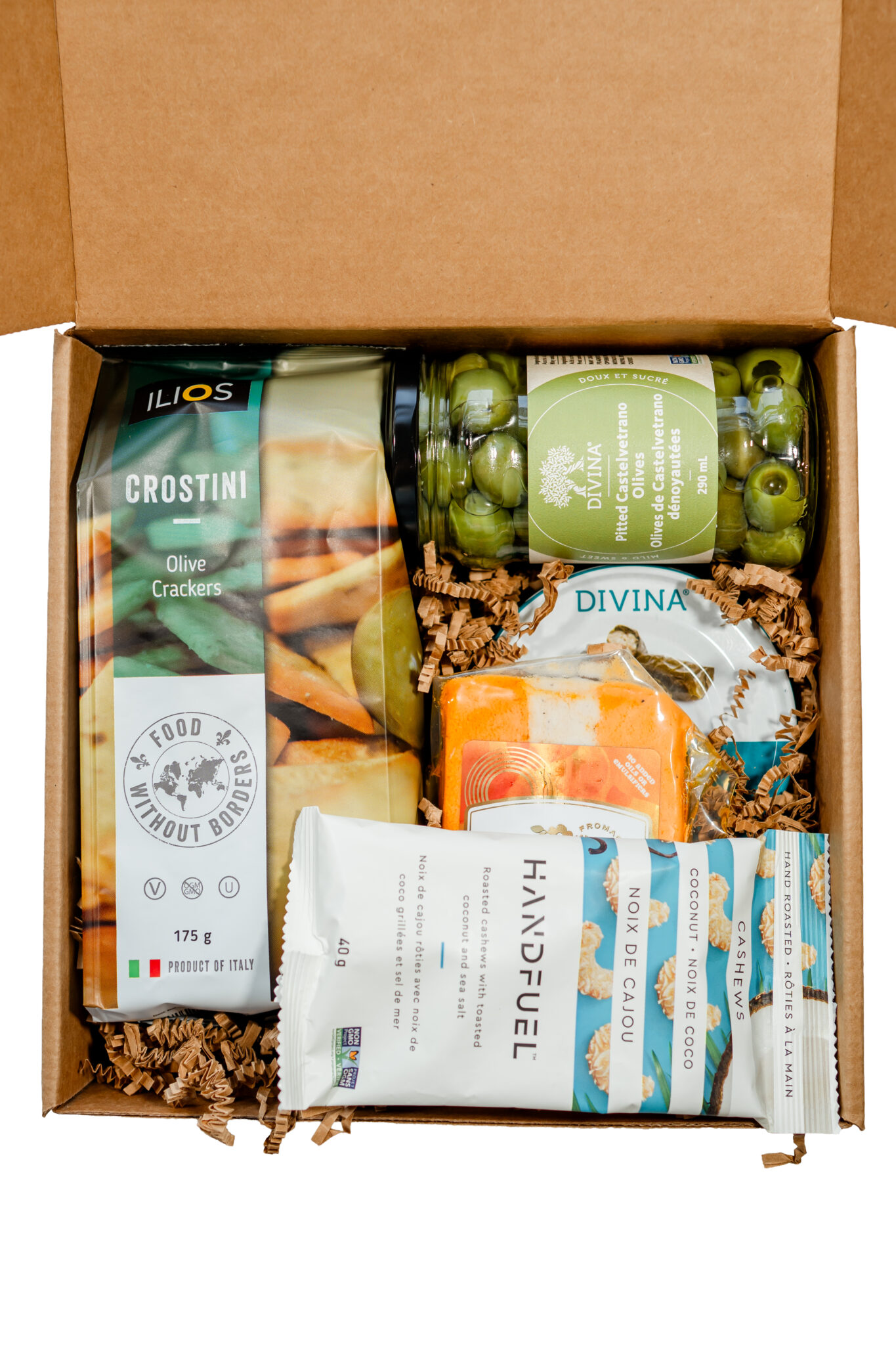 ilios crostini, dolmas, handfuel nuts, green goddess vegan cheese, organic pitted olives