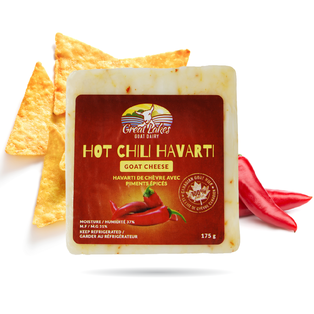 A true artisan take on a Danish-inspired classic! Made from 100% single source farmstead goat’s milk, this unique flavour of Goat Cheese Havarti is made with real hot chili peppers, with just enough kick to remember it. Whether you want to spice up your omelet game or impress your friends with a spicy Havarti dip, we know this one is going to be a hit.